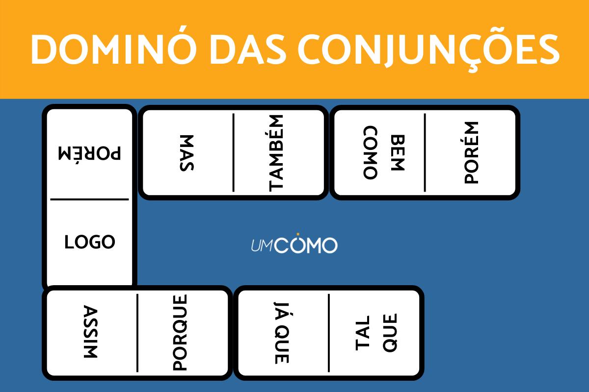 Apesar de clássico, o dominó pode ser repaginado e ser jogado de formas distintas, substituindo as bolinhas de 1 a 6 por outros elementos. No caso de educação infantil, você pode, por exemplo, utilizar imagens de animais para que as crianças memorizem seus nomes. Entretanto, quando tratamos de crianças mais velhas que têm aulas de português, esse pode se transformar em um jogo das conjunções. Para tal, basta que você escolha uma categoria de conjunção (por exemplo, aditivas) e a coloque nas peças para que os jogadores formem pares.