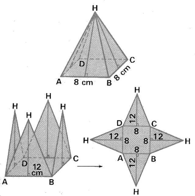 Área lateral da pirâmide = área do triângulo ABH x 4 = 48 x 4 = 192 cm²
