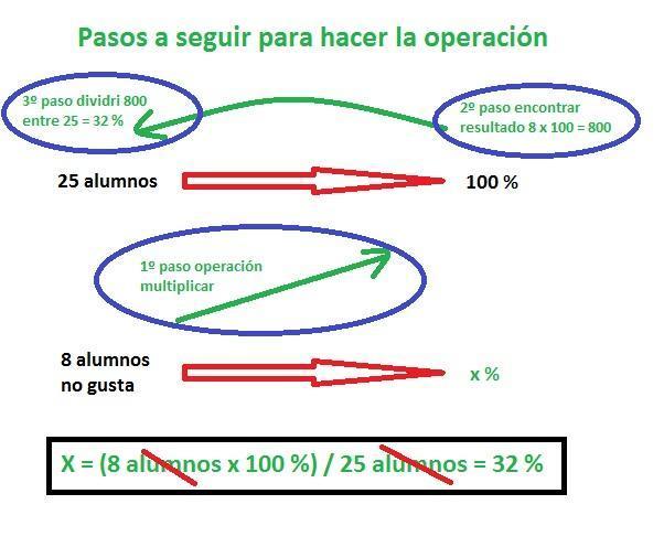 Neste caso temos que 25 = 100% (25 alunos são cem por cento da turma). E queremos calcular a percentagem de respostas negativas (8 alunos disseram que não gostam) sobre o total de alunos (25). A fórmula a aplicar é: (número de respostas negativas * 100) / total de alunos, ou seja, (8 x 100) / 25 = 32.