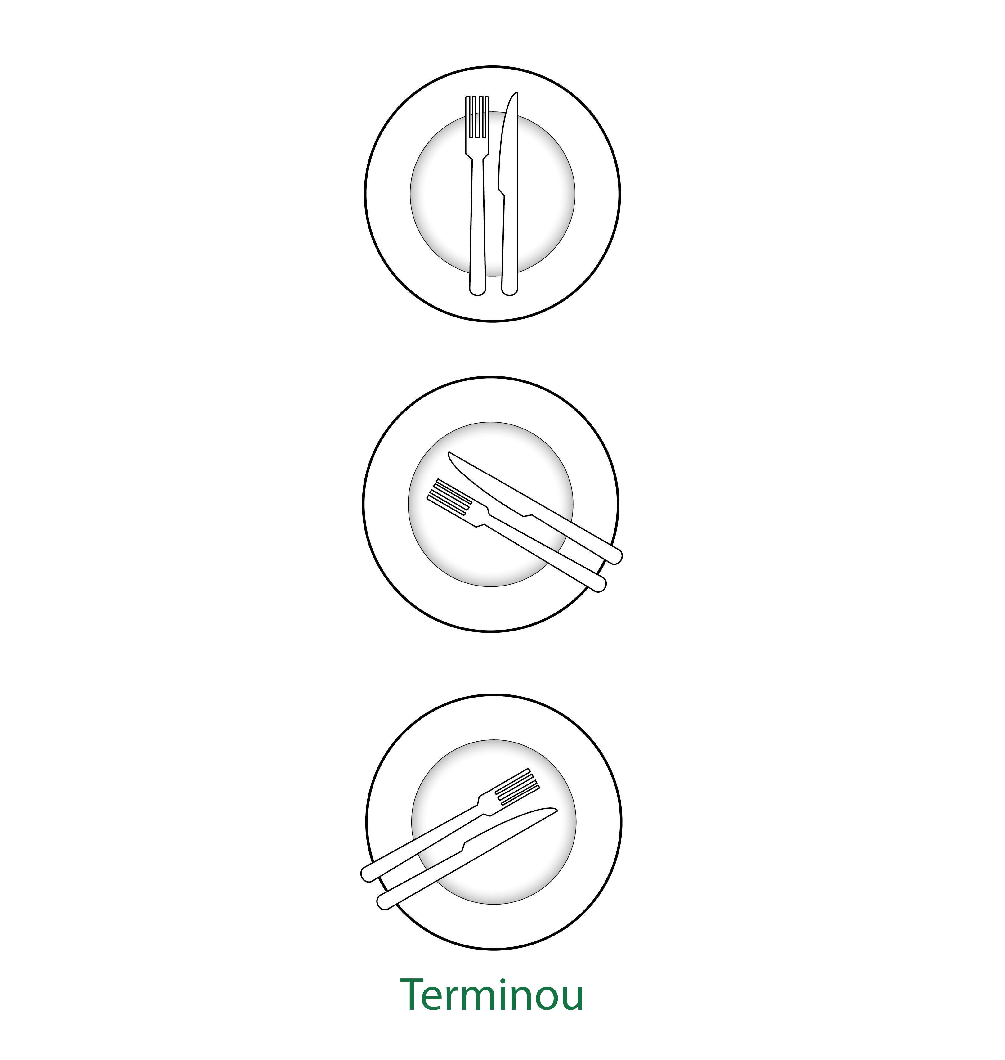 Uma vez que você tenha finalizado completamente sua refeição, terá diversas opções para colocar os talheres e indicar ao garçom que já pode retirar o prato. Deste modo, colocando sempre o garfo à esquerda da faca e com a serra da faca olhando para o centro do prato, é possível: