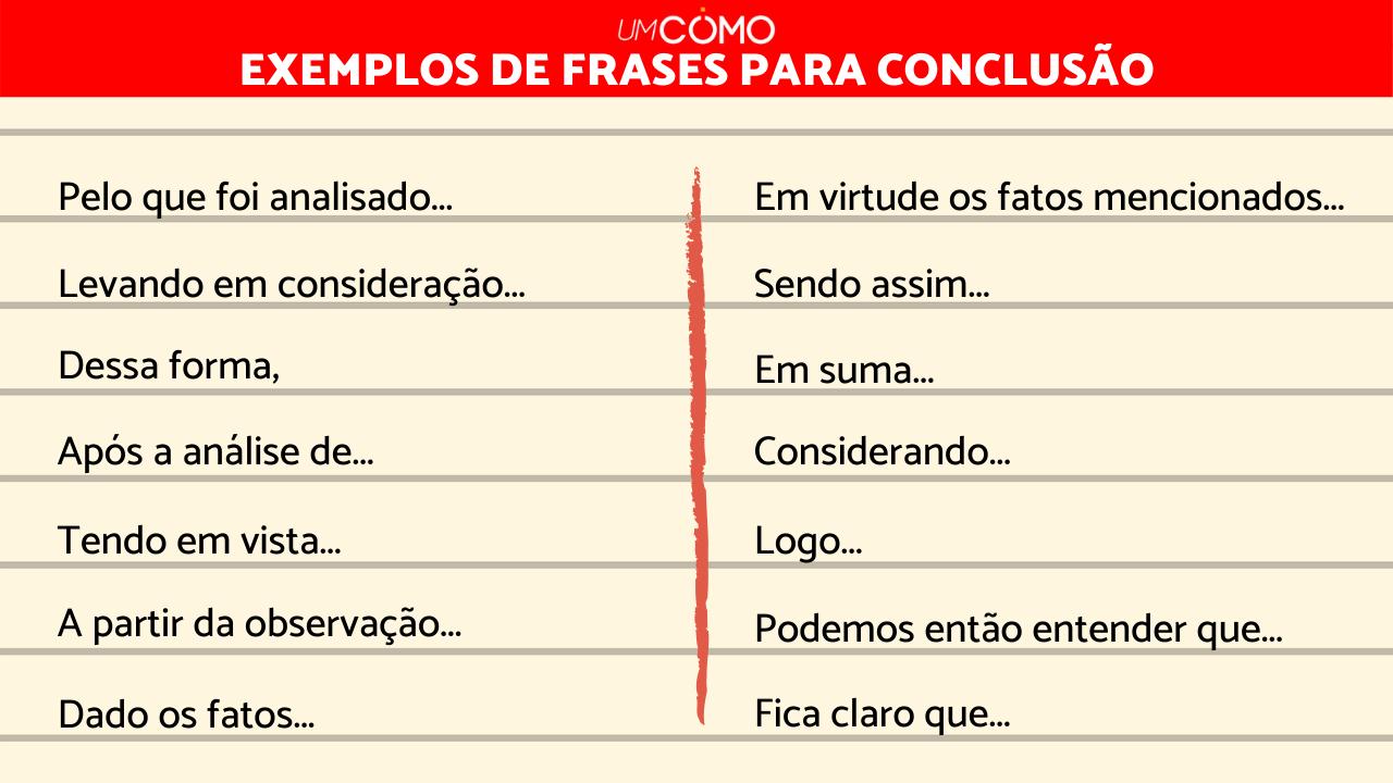Uma das formas de começar uma conclusão é utilizando palavras e expressões que darão a ideia de finalização e que, somadas ao fechamento das ideias desenvolvidas no texto, constituirão uma conclusão sucinta e objetiva. Veja abaixo uma lista de frases e palavras para começar uma conclusão: