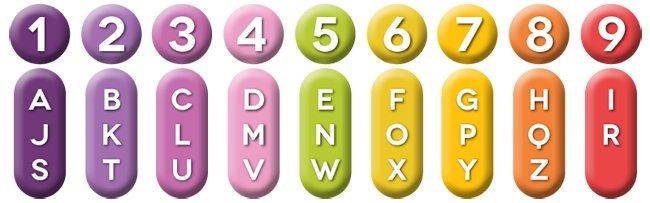 Atribua números às letras de todas as partes do nome (primeiro nome, segundo nome e sobrenomes) de acordo com a lista de baixo. Por exemplo, os números associados ao nome James são: J = 1, A = 1, M = 4, E = 5 e S = 1. 1 = AJS 2 = BKT 3 = CLU 4 = DMV 5 = ENW 6 = FOX 7 = GPY 8 = HQZ 9 = IR