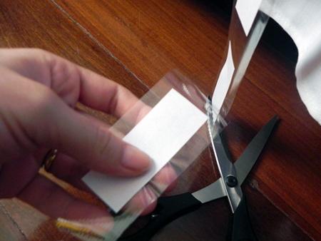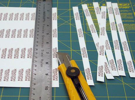 Agora, com os papeis recortados, desenrole parte da fita adesiva e deixe-a com a face colante para cima, depois cole cada papel com as informações viradas para baixo sobre a fita colante deixando um espaço de 3 cm aproximadamente entre cada etiqueta.