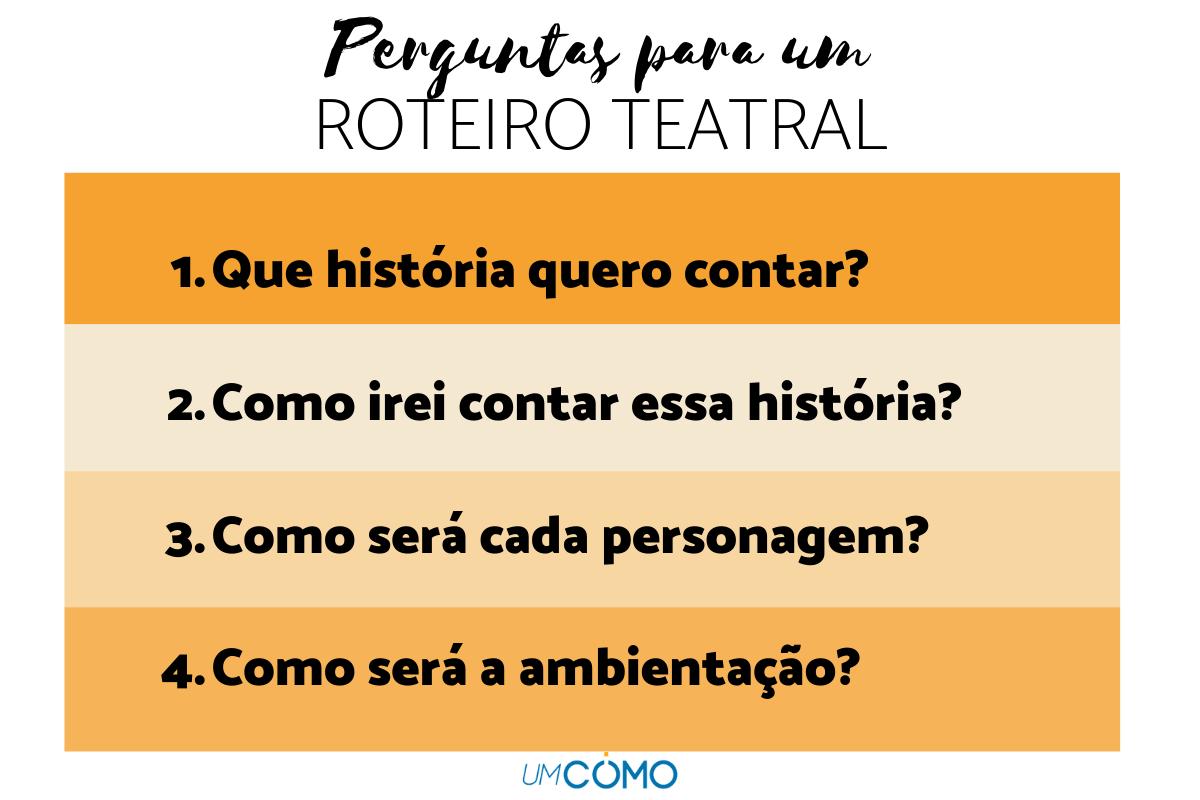 O roteiro teatral especifica todos os detalhes que devem ser levados em consideração durante as cenas, bem como as orientações a serem seguidas pelos participantes da peça: atores, diretores, técnicos, etc. Este texto contém todos os elementos que darão vida à obra, tais como os diálogos, ações, tipo de figurino, a iluminação ou o cenário. Desse modo, podemos dizer que o roteiro se encarrega de lançar o fio condutor da história que você deseja contar.