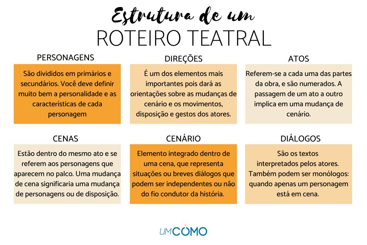 Assim, não falaremos apenas sobre a estrutura, mas também sobre todas as partes de um roteiro teatral, que são as seguintes: