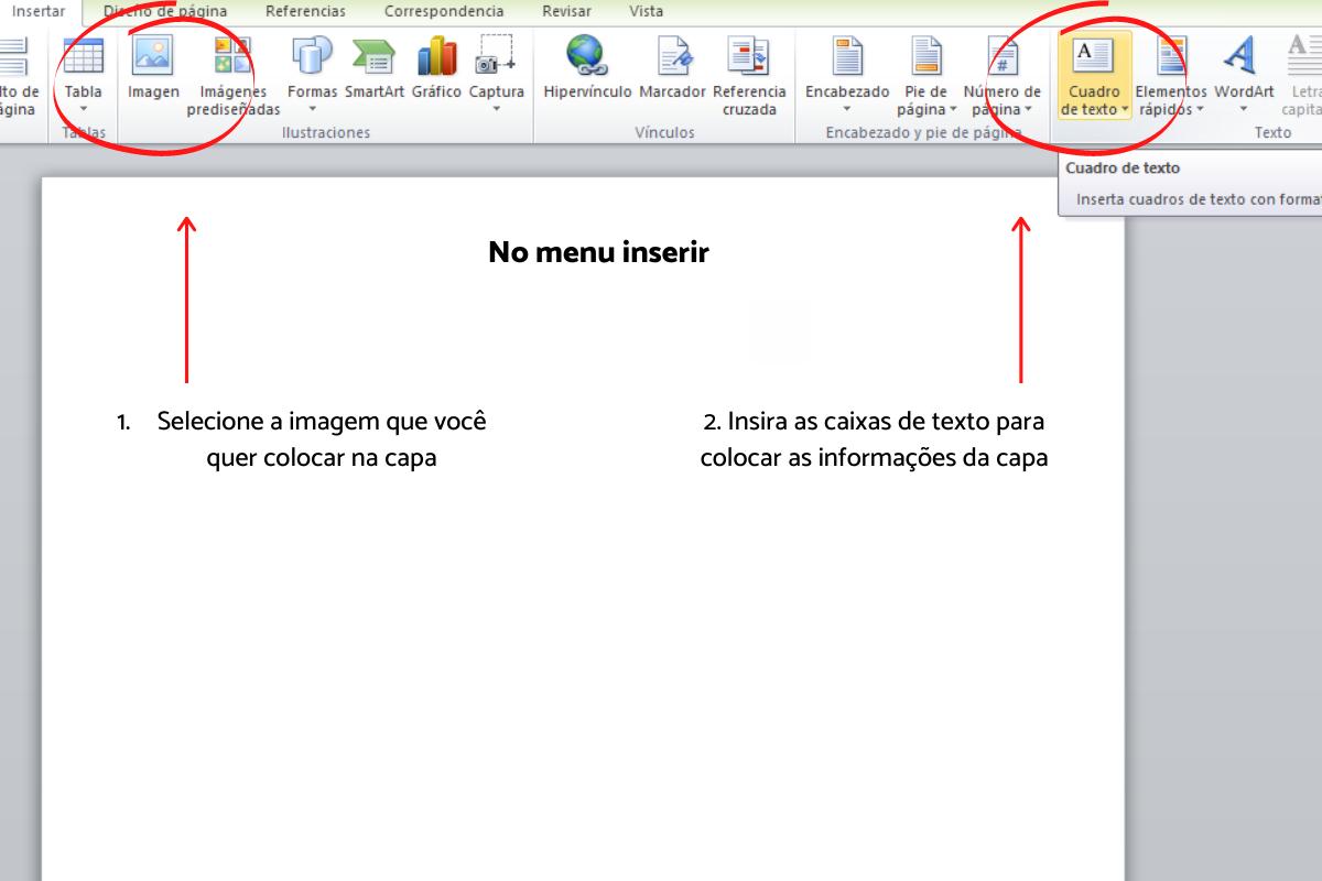 A inserção dos textos poderá ser feita utilizando caixas de texto, o que permite que você consiga escrever em cima da imagem e também alterar a posição de tudo que for escrito quantas vezes for necessário até encontra a posição ideal de cada elemento. Para inserir caixas de texto, basta ir novamente em "Inserir" e selecionar a opção.