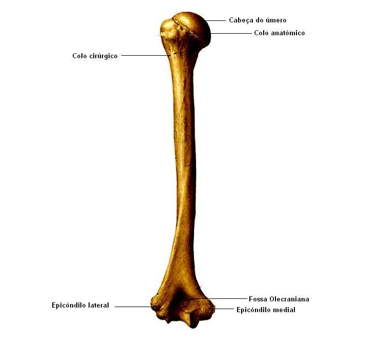 O úmero encontra-se no braço. É um osso bastante longo. Nele se inserem diferentes músculos para desenvolver a força. O braço e o antebraço estão unidos pela articulação do cotovelo. Nesta imagem você poderá ver o nome de cada parte que compõe o úmero.