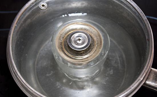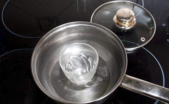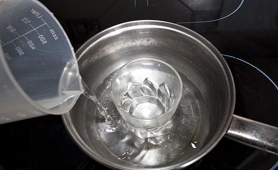Para isso o volume de água colocado dentro da panela não pode ultrapassar a altura do copo, deve ficar a cerca de 2 cm abaixo, pois quando a água ferver, não cairão gotas de água salgada dentro do copo.