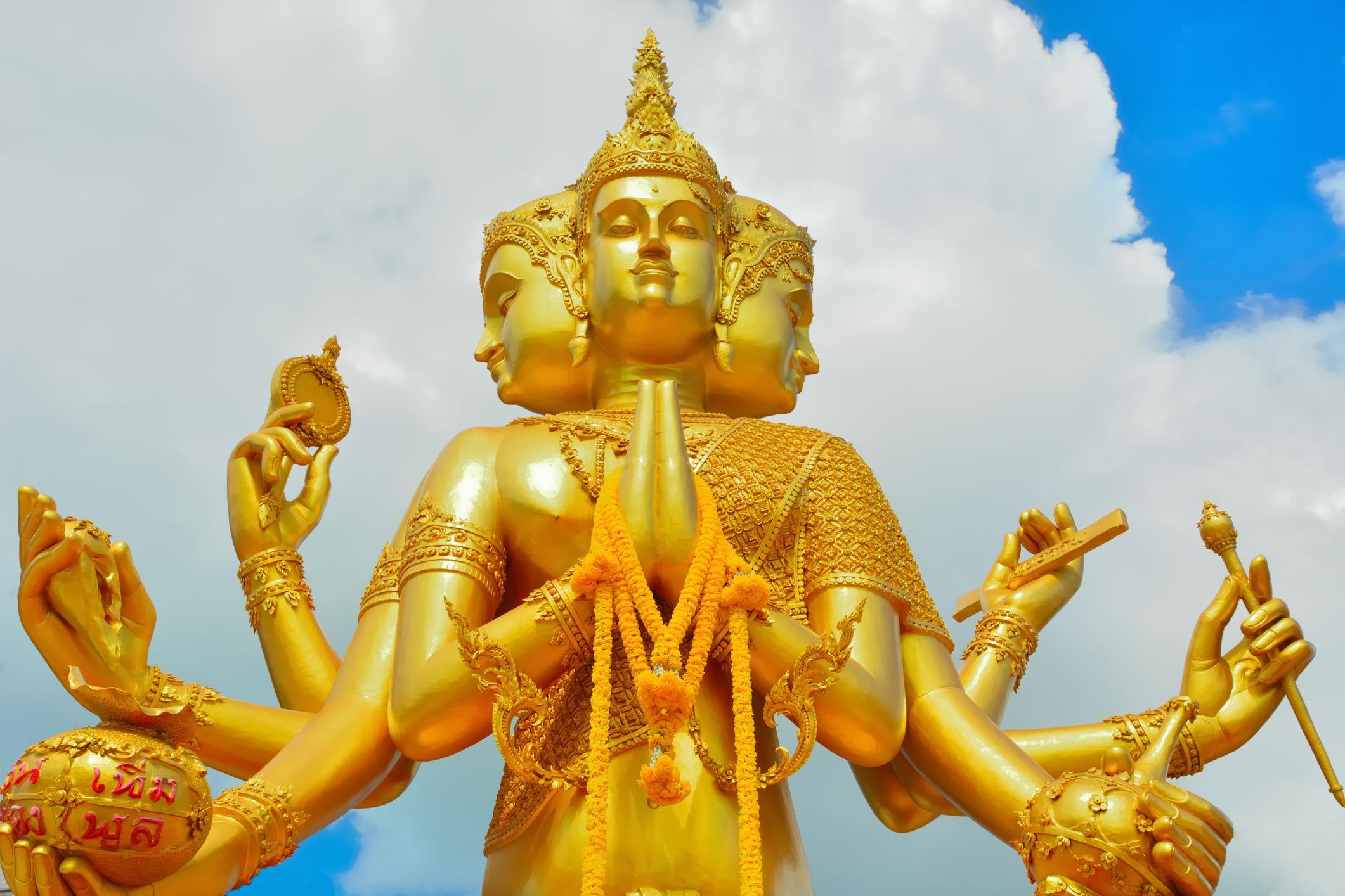 Brahma é o deus criador do Universo e faz parte da trindade das divindades mais importantes do hinduísmo, conhecida como Trimurti. Ele é representado com quatro faces, que simbolizam sua poderosa onipresença, e com quatro braços, que remetem aos diferentes elementos que compõem a essência do ser humano: consciência, inteligência, mente e ego.