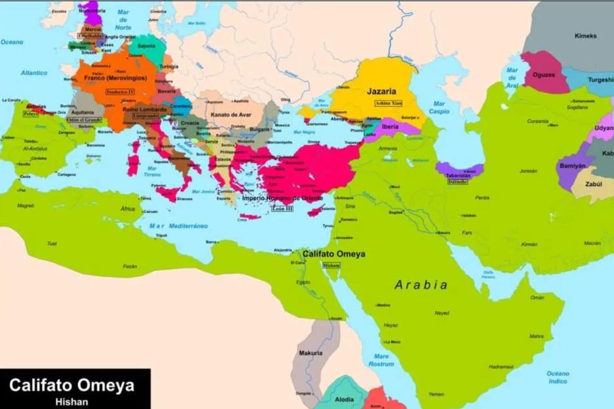 O ex-governador da Síria, Mu'awiya, fundou o Califado Omíada no ano de 661. Damasco foi a sua capital e incorporou o Magrebe, o Cáucaso e a Península Ibérica aos seus domínios. Tinha uma área máxima de 13 milhões de quilômetros quadrados, tornando-se o maior império visto no mundo até hoje.