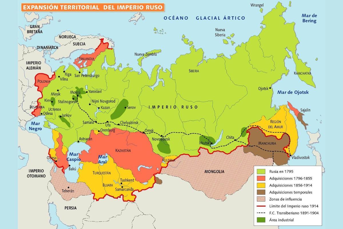 O Império Russo incluía os seguintes territórios: toda a atual Rússia, Alasca, atuais Finlândia e Polônia, antiga Pérsia e Manchúria. Atingiu uma área de 22,8 milhões de quilômetros quadrados e sua época de ouro foi entre 1721 e 1917, ano em que ocorreu a Revolução Russa.