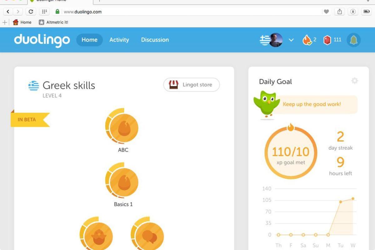 Você pode estabelecer uma meta diária de estudo (por exemplo, 5 ou 10 minutos por dia). O Duolingo envia lembretes para que você não perca sua "sequência". Assim, mantém uma sequência diária e metas personalizadas.