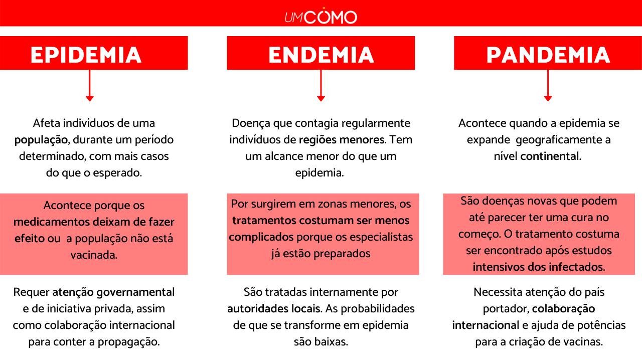 Como vimos, a diferença entre pandemia, epidemia e endemia pode confundir . Por isso, destacamos as diferenças que são mais relevantes: