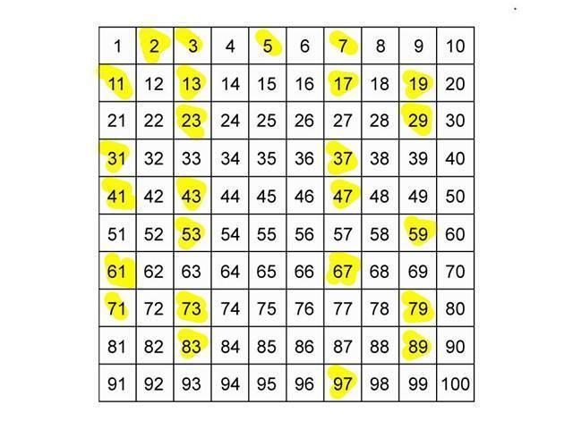 A seguinte tabela de 10 x 10 marca os números primos menores que 100.