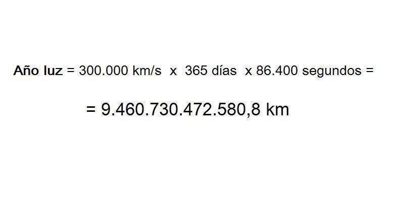 Para calcular a quanto equivale um ano luz, se deve multiplicar 300.000 km/s (velocidade da luz) por 365 dias (duração de um ano) e por 86.400 (segundos que tem um dia).