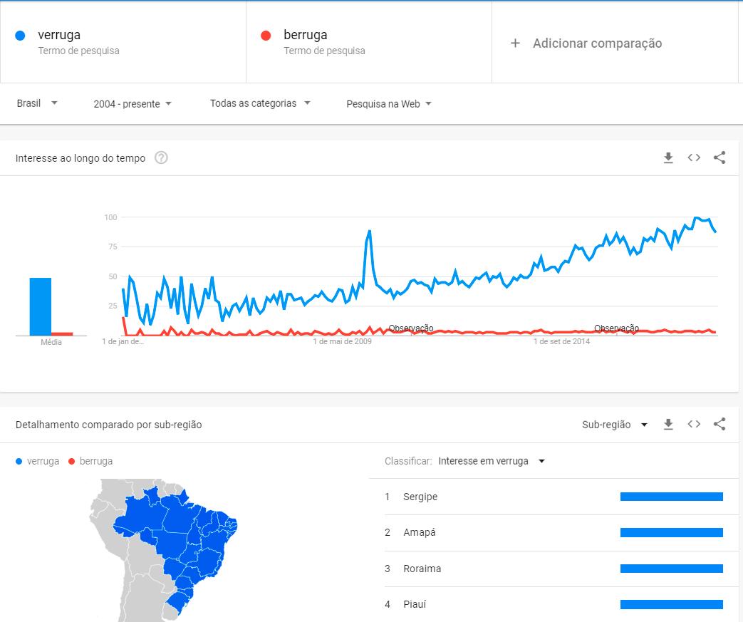 Note que, de acordo com o Google Trends, a palavra 'verruga' é muito mais procurada e usada nas buscas do Google do que a versão 'berruga', que também é correta: