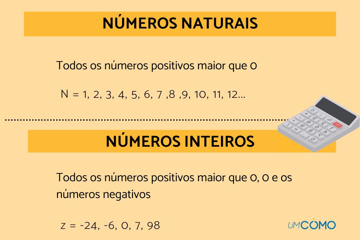 Por definição, nem todos os números inteiros são números naturais, mas pode-se dizer que todos os números naturais são inteiros. Aqui estão alguns exemplos de números inteiros: -33, -11, 0, 2, 44.