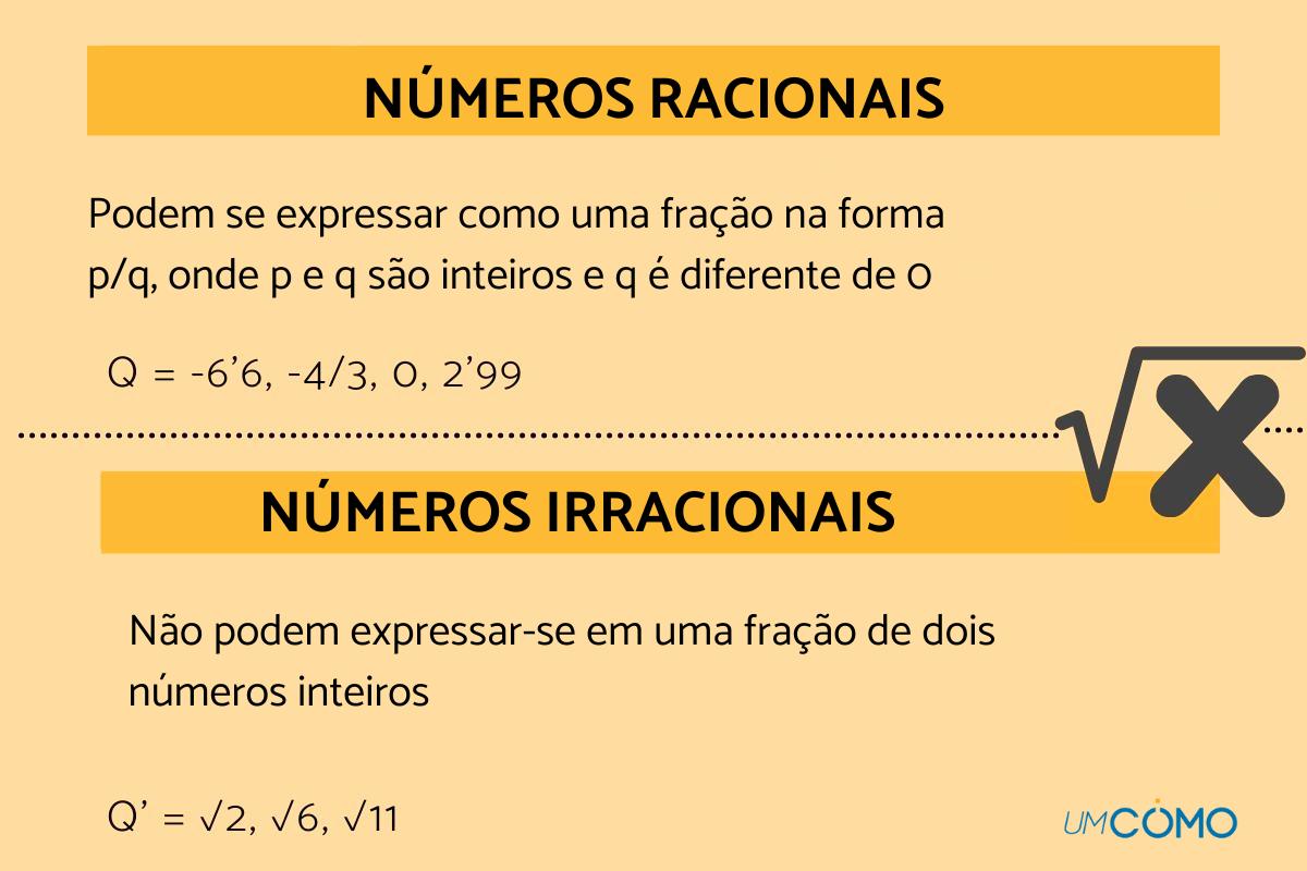 São aqueles números que não podem ser expressos como uma fração de dois números inteiros. Os irracionais têm decimais que nunca se repetem ou têm qualquer padrão. Para representá-los, utiliza-se a letra Q'.